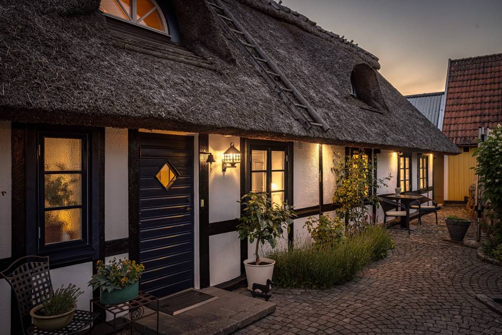 Südschweden / Skåne, bei Simrishamn - Exklusives Fachwerkhaus mit Strohdach in einer kleinen, idyllischen Gemeinde an der Ostsee. Gästehaus vorhanden. Entfernung zum Strand: 70 m.